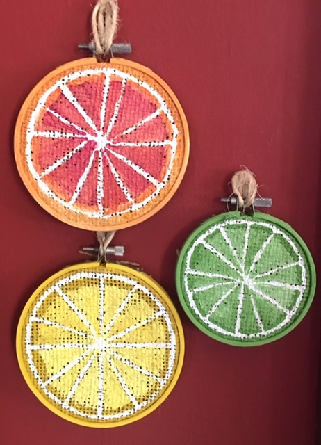 Capture a slice of summer by painting a citrus themed image over a framed burlap circle. This would be a bright spot to view in any room of your home. Great fun for both adults and children.