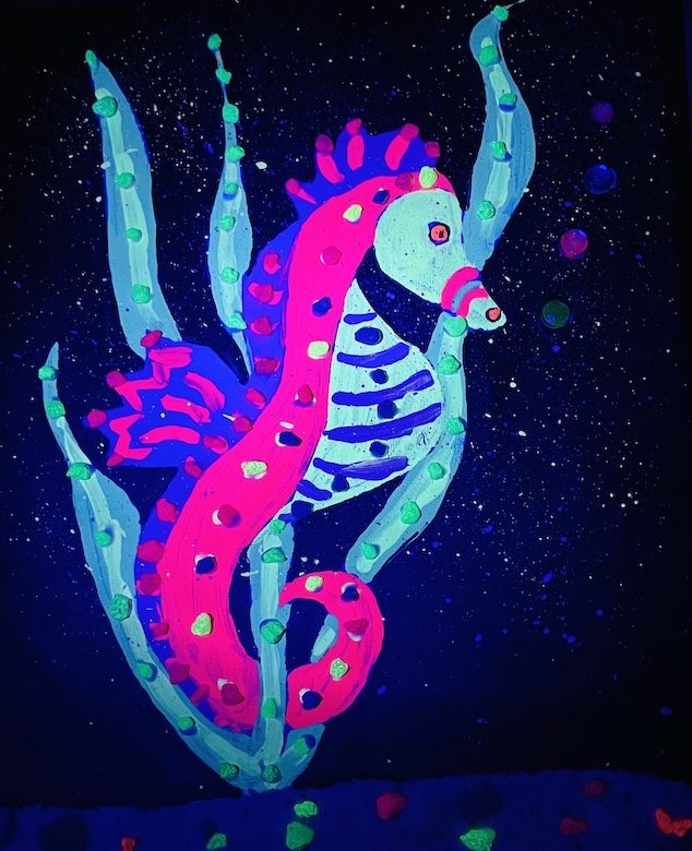 Kids, tweens and teens will enjoy creating a painting of a seahorse anchored onto seaweed and glowing (when exposed to black light). Doris will lead participants through a virtual guided drawing and painting during this fun Take & Make program. Canvases, glow in the dark paint plus mixed materials will be provided for all participants. Patrons can join in the fun via a live Zoom presentation or via a pre-recorded presentation