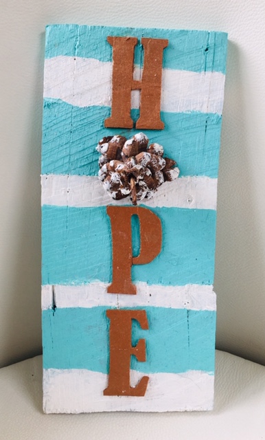 Kids will enjoy painting this message of hope onto reclaimed wood using stencils. A cheerful flower is added last, giving this work a pop of color. What a great gift idea for Mother’s Day!